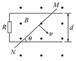 1、选择题 如图所示,平行导轨间距为d,一端跨接一个电阻R,匀强磁场的磁感应强度为B,方向垂直于平行金属导轨所在平面。一根金属棒与导轨成θ角放置,金属棒与导轨的电阻均不计。当金属棒沿垂直于棒的方向以恒定的速度v在金属导轨上滑行时,通过电阻R的电流是( )