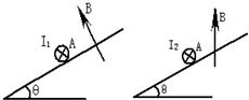 4、选择题 在同一光滑斜面上放同一导体棒,右、如图所示是两种情况的剖面图.它们所在空间有磁感应强度大小相等的匀强磁场,但方向不同,一次垂直斜面向上,另一次竖直向上:两次导体棒A分别通有电流I1和I2,都处于静止平衡.已知斜面的倾角为θ,则( )
