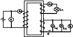 4、填空题 如图所示,理想变压器的次级有两组线圈,图中三个灯泡的规格相同,四个电表对电路的影响都可忽略不计.开关K断开时,灯L1正常发光,这时两电流表示数之比I1:I2是1:4;开关K闭合时,三个灯都正常发光,这时两电流表示数之比I1′:I2′=______,两电压表示数之比U1:U2=_______.