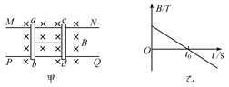 4、选择题 如下图甲所示,水平面上的光滑平行导轨MN、PQ上放着两根导体棒ab、cd,两棒中间用绝缘丝线系住.开始,匀强磁场垂直于纸面向里,磁感应强度B随时间t的变化如下图乙所示.I和FT分别表示流过导体棒中的电流和丝线的拉力.则在t0时刻( )