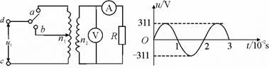 3、选择题 如图甲所示,理想变压器原.副线圈的匝数比为10:1,b是原线圈的中心抽头,图中电表均为理想的交流电表,定值电阻R=l0