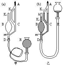 5、其他  麦克劳真空计是一种测量极稀薄气体压强的仪器,其基本部分是一个玻璃连通器,其上端玻璃管A与盛有待测气体的容器连接,其下端D经过橡皮软管与水银容器R相通,如图所示,图中K1、K2是互相平行的竖直毛细管,它们的内直径皆为d,K1顶端封闭,在玻璃泡B与管C相通处刻有标记m,测量时,先降低R使水银面低于m,如图甲所示,然后逐渐提升R,直到K2中水银面与K1顶端等高,这时K1中水银面比顶端低h,如图乙所示,待测容器较大,水银面升降不影响其中的压强,测量过程中温度保持不变,已知B(m以上)的容积为V,K1的容积远小于V,水银密度为ρ。