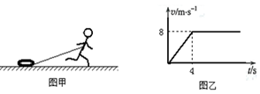 2、计算题  (10分)为了提高运动员奔跑时下肢向后的蹬踏力量,在训练中,让运动员腰部系绳拖汽车轮胎奔跑,已知运动员在奔跑中拖绳上端与地面的高度为1.2m,且恒定,轻质无弹性的拖绳长2m,运动员质量为60kg,车胎质量为12kg,车胎与跑道间的动摩擦因数为,如图甲所示,将运动员某次拖胎奔跑100m当做连续过程,抽象处理后的图象如图乙所示,,不计空气阻力。求: