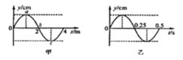 1、选择题 一列简谐波在均匀介质中传播。甲图表示振动开始后t=0.5秒时刻的波形图,乙图表示