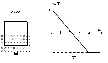 5、计算题 轻质细线吊着一质量为m=3kg,边长为L=1m、匝数n=10的正方形线圈总电阻为r=1Ω.在框的中间位置以下区域分布着矩形匀强磁场,如图甲所示.磁场方向垂直纸面向里,大小随时间变化如图乙所示.求: