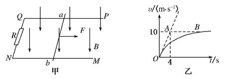 1、计算题 如图甲所示,空间存在B="0.5" T?方向竖直向下的匀强磁场,MN?PQ是放在同一水平面内的平行长直导轨,其间距L="0.2" m,R是连在导轨一端的电阻,ab是跨接在导轨上质量m="0.1" kg的导体棒.从零时刻开始,对ab施加一个大小为F="0.45" N?方向水平向右的恒定拉力,使其从静止开始沿导轨运动,此过程中棒始终保持与导轨垂直且良好接触,图乙是棒的速度—时间关系图象,其中AO是图象在O点的切线,AB是图象的渐近线.
