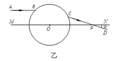 1、计算题 如图乙所示,MN是一条通过透明球体球心的直线.在真空中的单色细光束AB平行于MN射向球体,B为入射点,若出射光线CD与MN的交点P到球心O的距离是球半径的
