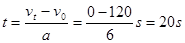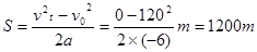 2、计算题  飞机着陆后以6m/s2的加速度匀减速运动,若着陆时的速度为120m/s.