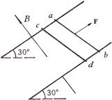2、计算题 (12分)如图所示,平行且足够长的两条光滑金属导轨,相距L=0.5m,与水平面夹角为θ=30°,导轨电阻不计,整个导轨处在垂直导轨平面向上的匀强磁场中,磁感应强度B=0.4T,垂直导轨放置两金属棒ab和cd,电阻均为R=0.1Ω,ab棒质量为m=0.1 kg,两金属棒与金属导轨接触良好且可沿导轨自由滑动.现ab棒在恒定外力F作用下,以恒定速度v=3 m/s沿着平行导轨向上滑动,cd棒则保持静止,试求: (取g=10m/s2)