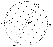 4、计算题 如图所示,在一个圆形区域内,两个方向相反且都垂直于纸面的匀强磁场分布在以直径A2A4为边界的两个半圆形区域Ⅰ、Ⅱ中,A2A4与A1A3的夹角为60°。一质量为m、带电量为+q的粒子以某一速度从Ⅰ区的边缘点A1处沿与A1A3成30°角的方向射入磁场,随后该粒子以垂直于A2A4的方向经过圆心O进入Ⅱ区,最后再从A4处射出磁场。已知该粒子从射入到射出磁场所用的时间为t,求Ⅰ区和Ⅱ区中磁感应强度的大小(忽略粒子重力)。