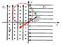 3、选择题 以竖直向上为y轴正方向的平面直角系xOy,如图所示.在第一、四象限内存在沿x轴负方向的匀强电场E1,在第二、三象限内存在着沿y轴正方向的匀强电场E2和垂直于xOy平面向外的匀强磁场.现有一质量为m、电荷量为q的带正电小球从坐标原点O以初速度v0沿与x轴正方向成45°角的方向射出.已知两电场的电场强度E1=E2=