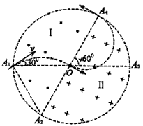 4、计算题 如图所示,在一个圆形区域内,两个方向相反且都垂直于纸面的匀强磁场分布在以直径A2A4为边界的两个半圆形区域Ⅰ、Ⅱ中,A2A4与A1A3的夹角为60°。一质量为m、带电量为+q的粒子以某一速度从Ⅰ区的边缘点A1处沿与A1A3成30°角的方向射入磁场,随后该粒子以垂直于A2A4的方向经过圆心O进入Ⅱ区,最后再从A4处射出磁场。已知该粒子从射入到射出磁场所用的时间为t,求Ⅰ区和Ⅱ区中磁感应强度的大小(忽略粒子重力)。