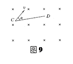 5、简答题  如图9所示,有一磁感应强度B=9.1×10-4T的匀强磁场,C、D为垂直于磁场的同一平面内的两点,它们之间的距离l=0.05m,今有一电子在此磁场中运动,它经过C点时的速度v的方向和磁场方向垂直,且与CD间的夹角α=30°,问: