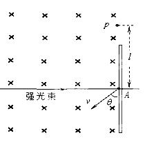 1、计算题   如图所示,金属条的左侧有垂直纸面向里的磁感应强度为B、面积足够大的匀强磁场.在金属条正上方,与A点相距上方l处有一涂有荧光材料的金属小球P(半径可忽略).一强光束照射在金属条的A处,可以使A处向各个方向逸出不同速度的电子,小球P因受到电子的冲击而发出荧光.已知电子的质量为m、电荷量为e.