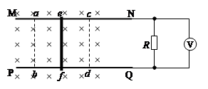 4、计算题 如图所示,固定在水平桌面上的光滑金属导轨MN、PQ,间距为L,其右端接有阻值为R的电阻和理想交流电压表,整个装置处在竖直向下的匀强磁场中,磁感应强度大小为B.导体棒ef垂直于导轨放置,且与两导轨接触良好,导体棒接入电路的电阻为r,其它电阻不计,现让导体棒在ab、cd之间往复运动,其速度随时间的关系为