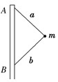 1、计算题 如图所示,把一个质量m=1kg的物体通过两根等长的细绳与竖直杆上A、B两个固定点相连接,绳a、b长都是1m,杆AB长度是1.6m,直杆和球旋转的角速度等于多少时,b绳上才有张力?