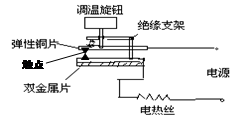 点评:本题难度较小,双金属片上层金属的膨胀系数大于下层金属,当温度升高时,双金属片便向下层弯曲,温度越高,弯曲越显著.要设定较高的温度,即温度较高时,使得金属片才能离开触点,只要将调温旋钮下降