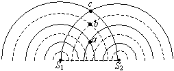 S1、S2连线的垂直平分线上所有的点都是振动加强的点.虽然相邻两圆弧间的距离都相等,但ab≠bc,目前处于平衡位置的点也不是ab和bc的中点.