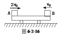 1、计算题 如图6-2-16所示,平板小车停在光滑水平面上,质量均为m的物块A和B从小车两端相向滑上小车上表面,它们的水平速度大小分别为2v0和v0.若小车质量为m,A和B与小车间的动摩擦因数均为μ,试问经过多少时间A和B相对静止?(小车足够长,A、B不相撞)