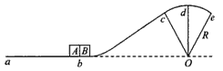 4、计算题 如图所示,一条轨道固定在竖直平面内,粗糙的ab段水平,bcde段光滑,cde段是以O为圆心、R为半径的 一小段圆弧,圆心O与ab在同一水平线上。可视为质点的物块A和B紧靠在一起,静止于b处,A的质量是B的3倍。两物块在足够大的内力作用下突然分离,分别向左、右始终沿轨道运动。B到d点时速度沿水平方向,此时轨道对B的支持力大小等于B所受重力的