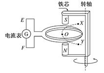 3、选择题 如图所示为一种早期发电机原理示意图,该发电机由固定的圆形线圈和一对用铁芯连接的圆柱形磁铁构成,两磁极相对于线圈平面对称在磁极绕转轴匀速转动过程中,磁极中心在线圈平面上的投影沿圆弧运动(O是线圈中心),则磁铁从O到Y运动过程,经过电流表的电流方向为(?)