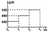3、选择题 某人在地面上用弹簧秤称得其体重为490 N。他将弹簧秤移至电梯内称其体重,t0至t3时间段内,弹簧秤的示数如图所示,电梯运行的v-t图可能是(取电梯向上运动的方向为正)
