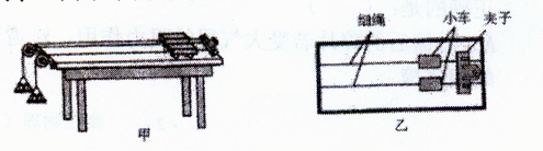 1、选择题 图甲是用来探究加速度和力之间关系的实验装置示意图,图乙是其俯视图。两个质量相等的小车,放在光滑水平桌面上,前端各系一条细绳,绳的另一端跨过定滑轮各挂一个小盘,盘里可放砝码。两个小车通过细线用夹子固定,打开夹子,小盘和砝码牵引小车运动,合上夹了,两小车同时停止。