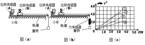 4、实验题 在“研究小车加速度与所受合外力的关系”实验中时,甲、乙两实验小组引进“位移传感器”、“力传感器”,分别用如图(a)、(b)所示的实验装置实验,重物通过细线跨过滑轮拉相同质量小车,位移传感器(B)随小车一起沿水平轨道运动,位移传感器(A)固定在轨道一端.在运动过程中位移传感器(B)发出信号,位移传感器(A)接收信号且显示小车运动的位移。甲组实验中把重物的重力作为拉力F,乙组直接用力传感器测得拉力F,改变重物的重力重复实验多次,记录多组数据,并画出a-F图像。