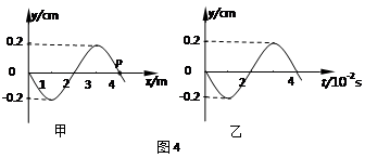1、选择题 一列横波在x轴上传播,图4甲为t=4.0×10-2s时的波动图像,图4乙为介质中质点P的振动图象,在x=2m处有一个精密的机械波接收分析仪器。对该波的传播方向和传播波速度的说法正确的是