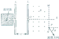 5、简答题 容器内某放射性原子在衰变生成新核过程中放出一个粒子,设该粒子的质量为m,电荷量为q,设粒子从放射源出进入平行极板S1窄缝时初速度近似为零,平板电极S1和S2间的电势差为U,粒子经电场加速后,沿OX方向进入磁感应强度为B、方向垂直纸面向外的有界匀强磁场,OX垂直平板电极S2,当粒子从P点离开磁场右边界MN时,其速度方向与OX方位的夹角θ=60°,如图所示,整个装置处于真空中.
