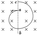 1、选择题 如图所示,匀强磁场中有一个电荷量为q的正离子,自a点沿半圆轨道运动,当它运动到b点时,突然吸收了附近若干电子,接着沿另一半圆轨道运动到c点,已知a、b、c在同一直线上,且ac=
