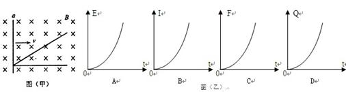 4、选择题 如图(甲)所示,一个用粗细均匀同质材料制成的“?”型导轨垂直于磁场固定在磁感应强度为B的匀强磁场中,a是与导轨相同的导体棒,导体棒与导轨接触良好。在外力作用下,导体棒以恒定速度v向右运动,以导体棒在图(甲)所示位置的时刻作为计时起点,则回路的感应电动势E、感应电流I、导体棒所受安培力F和电流产生的焦耳热Q随时间变化的图像正确的是图(乙)中的(? )