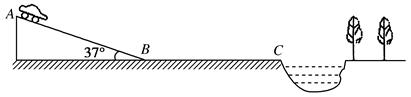 1、计算题  一小轿车从高为10 m、倾角为37°的斜坡顶端从静止开始向下行驶,当小轿车到达底端时进入一水平面,在斜坡底端115 m的地方有一池塘,发动机在斜坡上产生的牵引力为 ,在水平地面上调节油门后,发动机产生的牵引力为