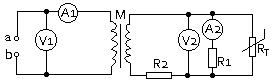 3、选择题  如图所示,M是理想变压器,将a,b接在电压u=314sin100πt V的正弦交流电源上。变压器右侧为一火警报警系统原理图,其中RT为用半导体热敏材料制成的传感器(其电阻率随温度升高而减小),电流表A2为值班室的显示器,显示通过R1的电流,电压表V2显示加在报警器上的电压(报警器未画出),R2为定值电阻,当传感器RT所在处出现火警时,以下说法中正确的是