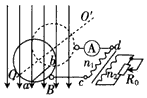 1、选择题 如图所示,导体棒ab两个端点分别搭接在两个竖直放置、电阻不计、半径相等的金属圆环上,圆环通过电刷与导线c、d相接。c、d两个端点接在匝数比n1:n2=10:1的变压器原线圈两端,变压器副线圈接一滑动变阻器R0。匀强磁场的磁感应强度为B,方向竖直向下,导体棒ab长为l(电阻不计),绕与ab平行的水平轴(也是两圆环的中心轴)OO"以角速度ω匀速转动,如果滑动变阻器的阻值为R时,通过电流表的电流为I,则?