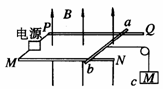 3、计算题 (15分)如图所示,PQ和MN为水平放置的平行金属导轨,间距为l=1.0m,导体棒ab跨放在导轨上,棒的质量为m=20g,棒的中点用细绳经轻滑轮与物体c相连,物体c的质量M=30g。在垂直导轨平面方向存在磁感应强度B=0.2T的匀强磁场,磁场方向竖直向上,重力加速度g取10m/s2。
