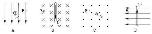 本题解析:磁场可以对放入其中的电流和运动电荷产生力的作用,但电流的方向或电荷的运动方向一定与磁场方向不平行。当电流(或电荷的运动方向)与磁场垂直时,在相同的条件下,所受的安培(洛仑兹)力最大。图中ABD三个选项中,电流都是和磁场垂直的,这时受到的安培力最大。而C中电流和磁场方向相反,不受安培力的作用。