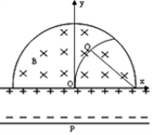 2、计算题 如图所示,在以原点O为圆心、半径为R的半圆形区域内充满了磁感应强度为B的匀强磁场,x轴下方为一平行板电容器,其正极板与x轴重合且在O处开有小孔,两极板间距离为