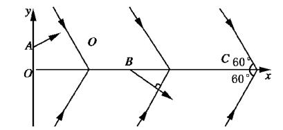 4、计算题 如图所示,在正交坐标系xOy的第一、四象限内分别存在两个大小相等、方向不同的匀强电场,两组平行且等间距的实线分别表示两个电场的电场线,每条电场线与x轴所夹的锐角均为60°.一质子从y轴上某点A沿着垂直于电场线的方向射入第一象限,仅在电场力的作用下第一次到达x轴上的B点时速度方向正好垂直于第四象限内的电场线,之后第二次到达x轴上的C点.求OB与BC的比值。