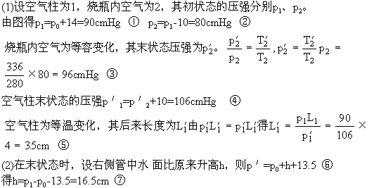 3、简答题  如图所示为验证查理定律的实验装置,A为烧瓶,内贮空气,B为水银压强计(两管粗细相同)。由于组装不慎,U形管左侧水银柱10cm下方有一段4cm的空气柱,左侧水银柱上表面齐标志线E。开始时烧瓶所在水槽内水温为7℃,U形管两边水银面相平。当水温升至63℃时,上下调整右边开口水银管,使左侧水银柱上表面齐标志线E。此时