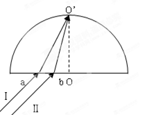 5、选择题 如图所示,有一半球形玻璃砖,Ⅰ、Ⅱ两束不同频率的单色光从玻璃砖底边平行射入,a、b为入射点(均在玻璃砖底边圆心O的左侧),两束光进入玻璃砖后一起射到O’点,O’O垂直底边,下列说法正确的是