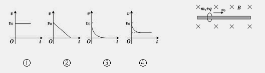 3、选择题 如图所示,一质量为m、电荷量为+q的圆环可在水平放置的足够长的粗糙细杆上滑动,细杆处于磁感应强度为B的匀强磁场中,不计空气阻力,现给圆环向右的初速度v0,在以后的运动过程中,圆环运动的速度图象可能是图中的(?)