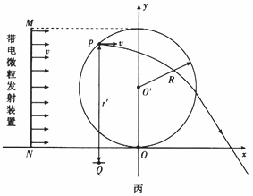 带电微粒在磁场中经过一段半径为r′的圆弧运动后,将在y同的右方(x>0)的区域离开磁场并做匀速直线运动,如图丙所示。靠近M点发射出来的带电微粒在穿出磁场后会射向x轴正方向的无穷远处,靠近N点发射出来的带电微粒会在靠近原点之处穿出磁场