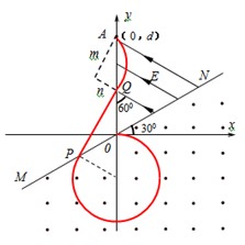 3、计算题 (12分)如图所示,在xoy平面内,直线MN与x轴正方向成30o角,MN下方是垂直于纸面向外的匀强磁场,MN与y轴正方向间存在电场强度E=×105N/C的匀强电场,其方向与y轴正方向成60o角且指向左上方,一重力不计的带正电粒子,从坐标原点O沿x轴正方向进入磁场,已知粒子的比荷