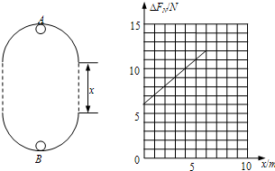 2、计算题 (9分)如图所示,在同一竖直平面内两正对着的相同半圆光滑轨道,相隔一定的距离,虚线沿竖直方向,一小球能在其间运动。今在最低点与最高点各放一个压力传感器,测试小球对轨道的压力,并通过计算机显示出。当轨道距离变化时,测得两点压力差与距离x的图像如图所示。(不计空气阻力,g取10 m/s2)求: