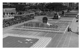 4、计算题 如图所示,2009年国庆群众游行队伍中的国徽彩车,不仅气势磅礴而且还是一辆电动车,充一次电可以走100公里左右.假设这辆电动彩车总质量为6.75×103 kg,当它匀速通过天安门前500 m的检阅区域时用时250 s,驱动电机的输入电流I=10 A,电压为300 V,电动彩车行驶时所受阻力为车重的0.02倍.g取10 m/s2,不计摩擦,只考虑驱动电机的内阻发热损耗能量,求:?
