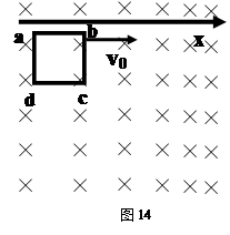 2、计算题 如图14所示,竖直平面内有一边长为L、质量为m,电阻为R的正方形线框在竖直向下的匀强重力场和水平方向的磁场组成的复合场以初速度v0水平抛出(忽略空气阻力)。运动过程中正方形线框始终在磁场中运动且磁场方向与线框平面始终垂直,磁场的磁感应强度随水平向右的x轴按B=B0+kx的规律均匀增大。(已知重力加速度为g)求: