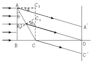 参考答案:平行光束经棱镜折射后的出射光束仍是平行光束,如下图所示.图中θ1、θ2为AC面上入射角和折射角,根据折射定律,有
