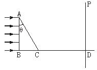5、计算题 如图所示,△ABC为一直角三棱镜的截面,其顶角θ=30°,P为垂直于直线BCD的光屏,现一宽度等于AB的单色平行光束垂直射向AB面,在屏P上形成一条宽度等于