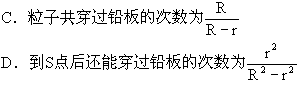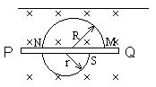 PQ为厚度均匀的铅板,放置在垂直纸面向里的匀强磁场中,如图所示,带电粒子自M点进入匀强磁场,沿半径为R的圆弧运动到N点,穿过铅板沿半径r 的圆弧继续运动,并且R>r,设粒子每次穿过铅板损失的动能都一样,则[ ]